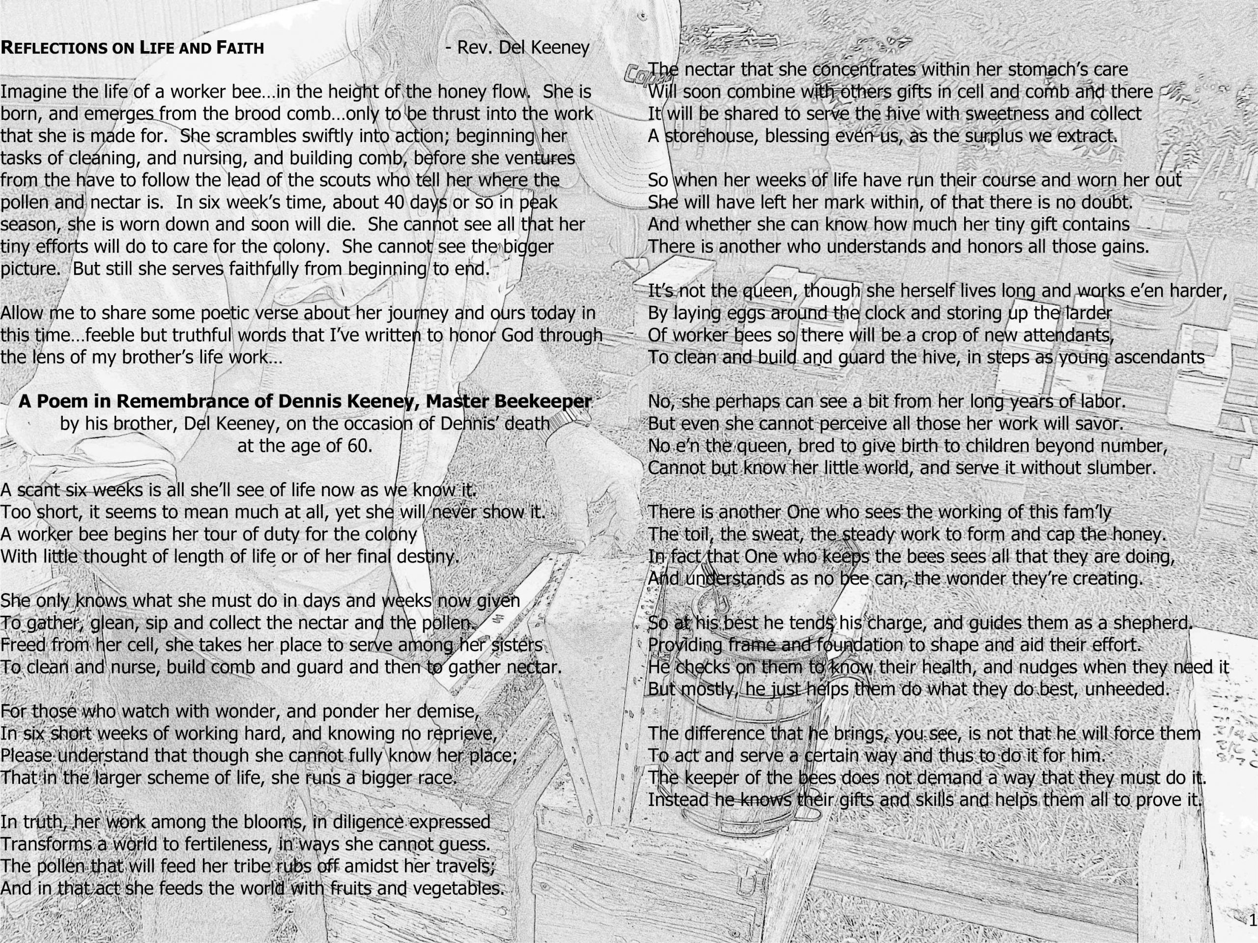 Dennis was an experienced beekeeper, a breeder of queen bees and was named Beekeeper of the year in 2003 by the PA State Beekeepers Association.