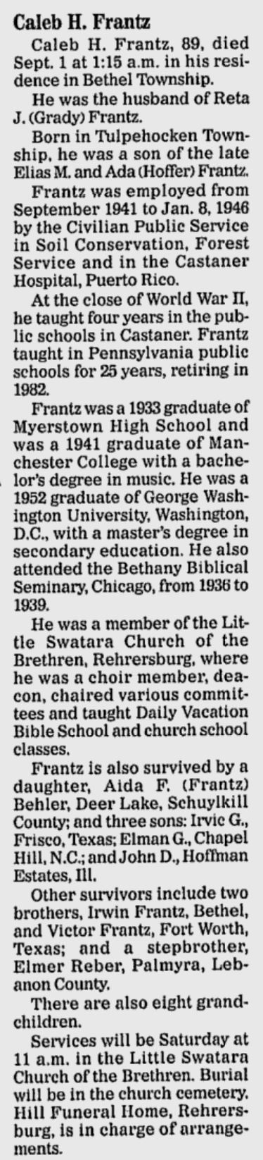 Reta is survived by her four children: Irvic G. Frantz, husband of Lois, Frisco, Texas; Elman G. Frantz, husband of Janese, Chapel Hill, N.C.; John D. Frantz, husband of Priscilla, South Barrington, Ill.; Aida F. Behler, wife of Tom, Deer Lake, Pa. She is also survived by eight grandchildren; and seven great-grandchildren.